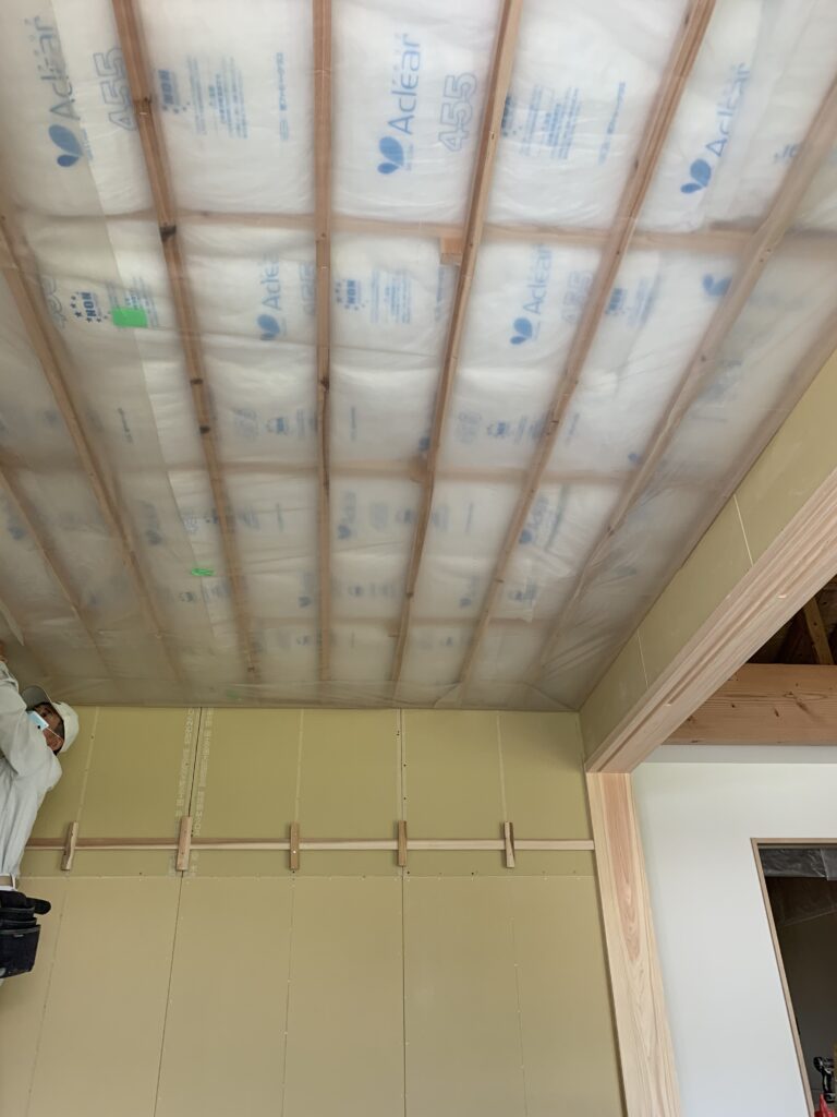 壁PBを先張りで梁まで掛けて張り、その後に天井を仕上げます。